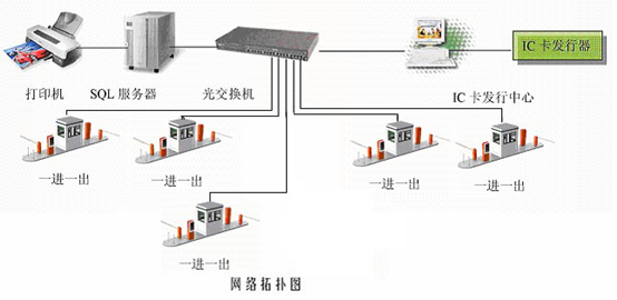 停车场智能管理系统由远距离读卡器、近距离金属票箱、自动道闸、车辆检测器、自动出卡机、电子显示屏、主控制板、超声波车位探测器、中央控制器和节点控制器以及软件系统组成,其网络拓扑结构如下图所示: