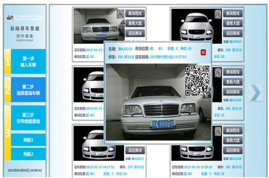 该系统同时还结合了反向寻车功能,在商场、购物中心等大型停车场内,车主在返回停车场时往往由于停车场空间大,环境及标志物类似、方向不易辨别等原因,容易在停车场内迷失方向,寻找不到自己的车辆。反向寻车系统通过进场之后刷卡签停的形式,在用户寻找车位时实现了在查询端刷卡、条形码,显示车主及车辆所处的位置,帮助顾客尽快找到车辆停放的区域。