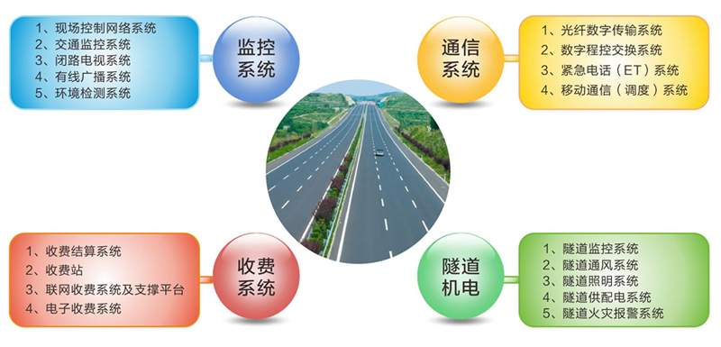 高速公路机电系统主要包括“三大系统”和“隧道机电系统”。其中“三大系统”包括:监控系统(收费站及道路监控)、收费系统、通信系统;“隧道机电系统”一般包括隧道监控系统、隧道通风照明系统、隧道供配电系统及隧道火灾报警系统等。